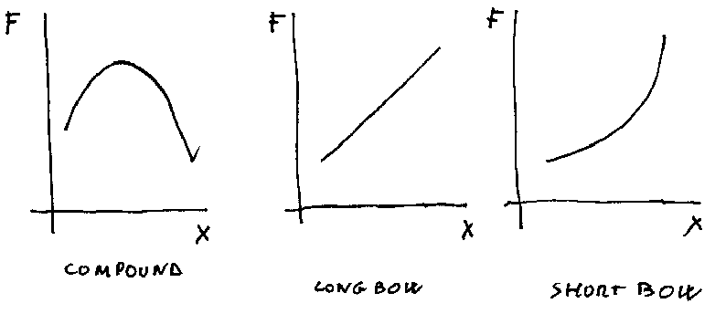 These effects are very difficult to include in Hickman's model, and even if it were easy, it would force us to introduce a number of variable parameters that would destroy the simplicity of the model. But the fact that the model does not reproduce reality in a perfect way does not mean that it is useless. On the contrary it, helps us to understand the physical phenomena going on. In telling us about an ideal system, it has permitted us to isolate those effects which are far from ideal and which eventually have to do with the behavior or real world materials. From these considerations we can conclude that the most rigid and lighter strings are the best for archery, which is again in agreement with the conventional archer's wisdom. I've also the impression that in many modern bows the bracing height could be reduced without any loss of performance. Some modern bows may be somewhat "overbraced", perhaps because the use of fiberglass and other modern materials does forgive a deformation of the limbs that would be dangerous for older materials. But, as we saw, there are several effects that go on and which tend to compensate each other, so that the bracing height turns out to be a very forgiving parameter.